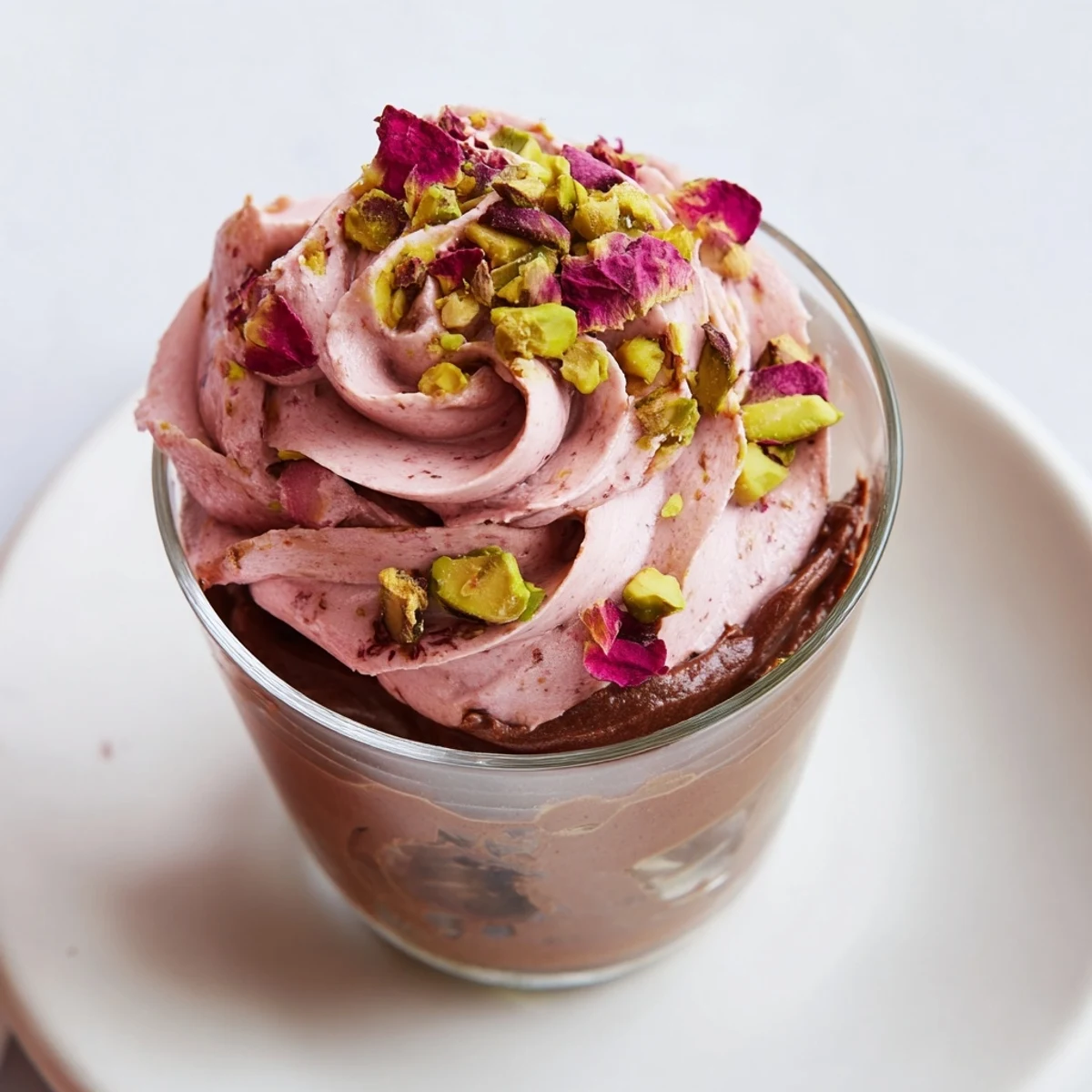 This elegant dessert combines silky dark chocolate mousse infused with warm cardamom spice, creating layers of velvety richness. The mousse gets texture from honey-toasted pistachios scattered throughout, while a final topping of lightly sweetened rosewater cream adds floral notes that perfectly complement the deep chocolate flavors.