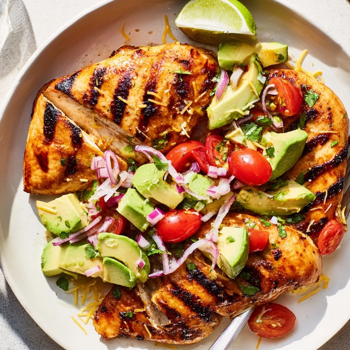 Bright Tex-Mex chicken breasts marinated in lime, olive oil, garlic, honey and spices, grilled 6–8 minutes per side. Top with diced avocado, cherry tomatoes, red onion and cilantro; add cheese during the final minutes if desired. Prep 20 minutes, cook 20 minutes, serves four. Add crushed red pepper for heat and serve with rice, tortillas or a fresh salad.