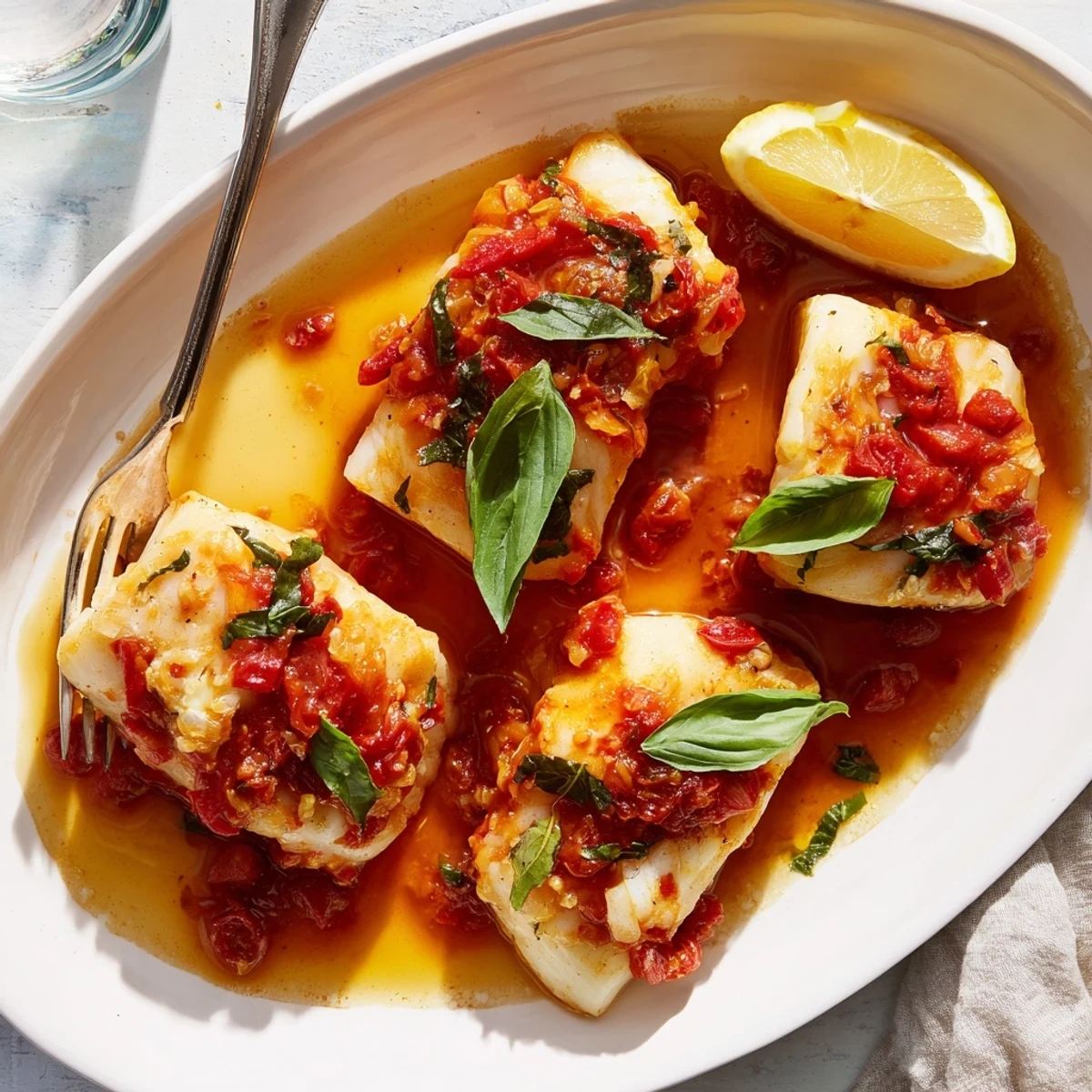 This elegant preparation transforms halibut fillets through a unique two-stage cooking method. First, the fish poaches gently in a velvety tomato-butter sauce infused with garlic, shallots, white wine, and fresh basil. The gentle poaching keeps the halibut incredibly moist while allowing it to absorb the vibrant flavors. A final finish on the grill adds a subtle smoky dimension that elevates the dish without overpowering the delicate seafood. The result is perfectly cooked fish with a luxurious, silky sauce that balances sweetness from ripe tomatoes with richness from butter. It's an impressive yet manageable main dish that feels special enough for entertaining but comes together quickly enough for a weeknight dinner.
