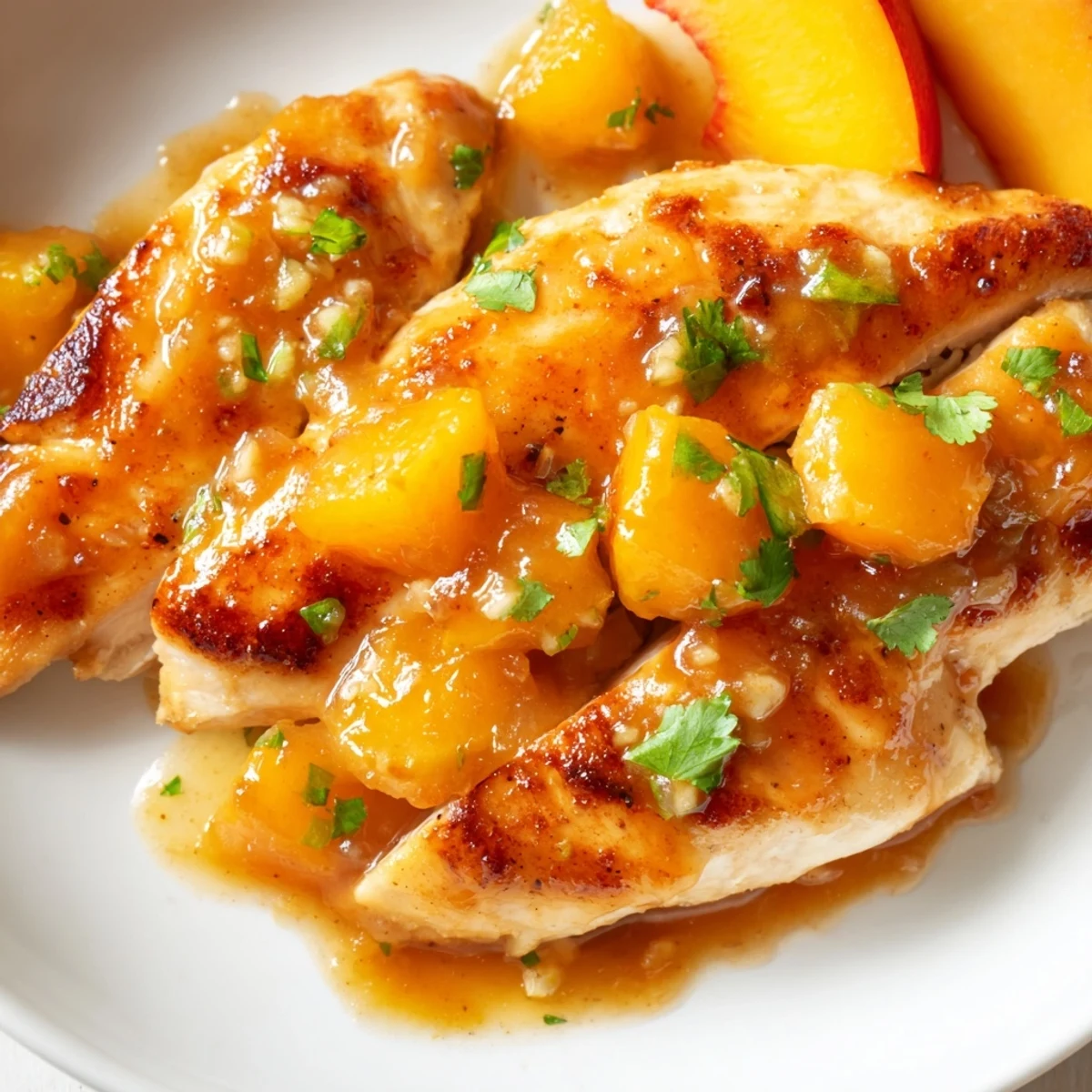 - Let the chicken rest 2–3 minutes before serving with extra sauce, peach slices, and fresh herbs