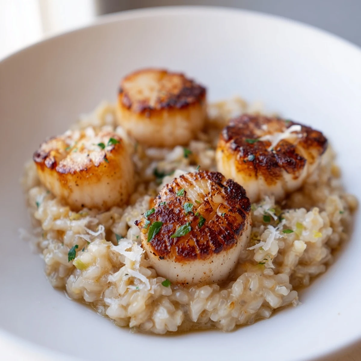 - Flip scallops and cook another 1–2 minutes until just opaque in the center, then serve over risotto with fresh herbs and lemon wedges