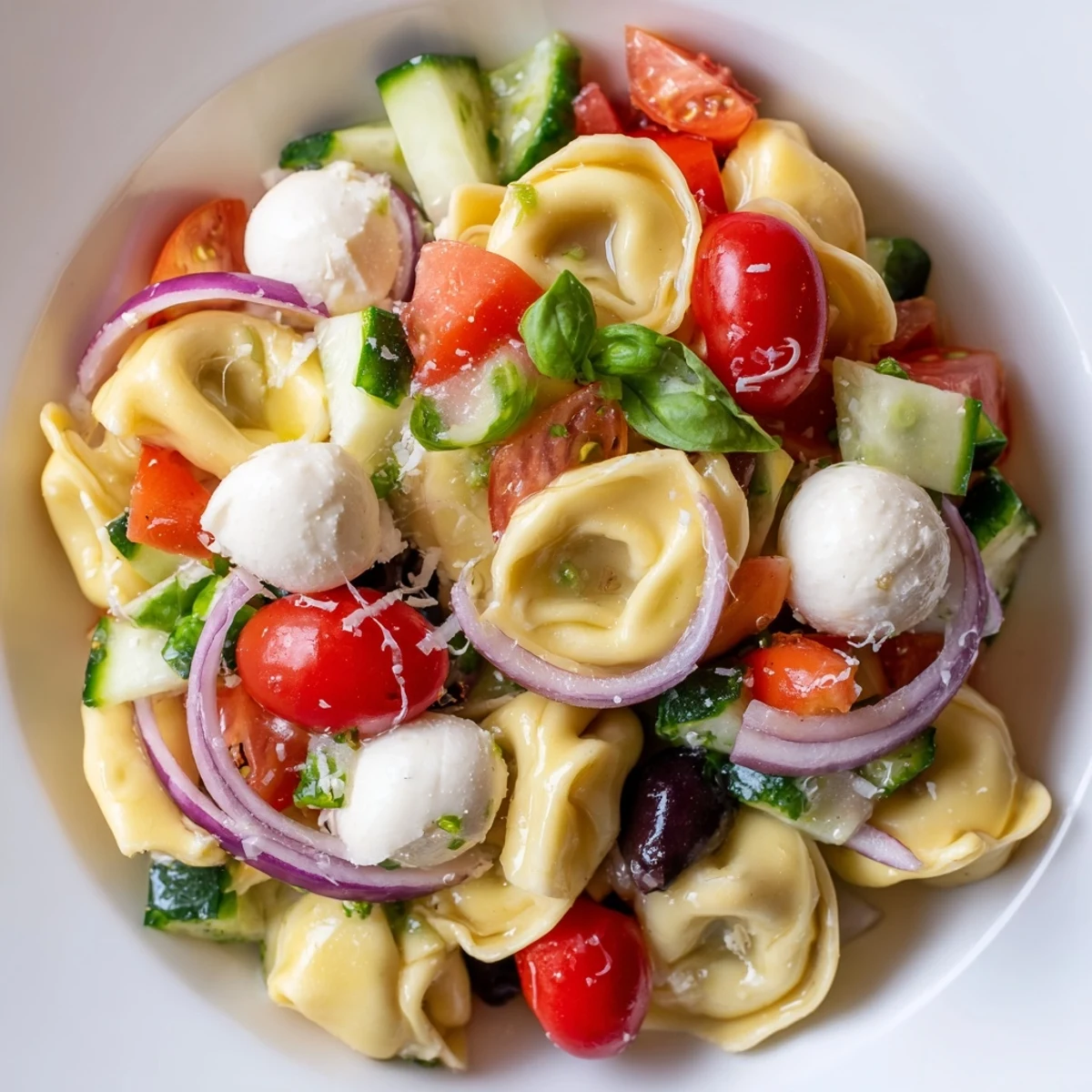 This vibrant Italian-American salad combines tender cheese-filled tortellini with crisp cherry tomatoes, cucumber, red bell pepper, and black olives. Fresh mozzarella and basil add brightness while a homemade zesty dressing ties everything together.